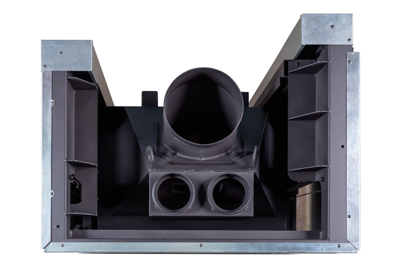 Система забора воздуха извне, имеет два встроенных патрубка диаметром 125 мм для подключения забора воздуха на горение из соседнего помещения, улицы, подвала, и повышает надежность работы топки.