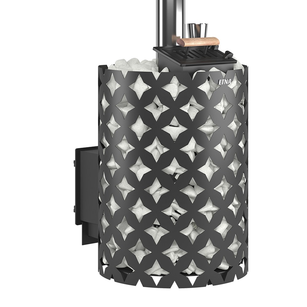 Для устройства наружной открытой каменки печь ЭТНА ЗК 18 оснащается металлическим кожухом с прорезным рисунком оригинального дизайна. Пространство между печью и кожухом из двухмиллиметровой стали заполняется камнями для бани, которые выполняют роль теплонакопителя, перераспределяют тепло от стенок топки и защищают парящихся от жёсткого инфракрасного излучения. Воду подают на нагретые камни, с которых полученный пар распространяется по всему объёму парной. Кожух диаметром 560 миллиметров вмещает в себя до 110 килограммов камней крупной и средней фракции.