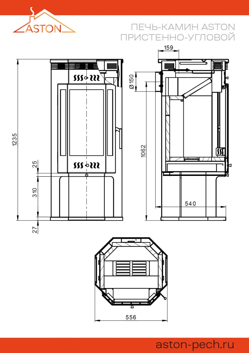 Печь-Камин ASTON 11кВт (180 м3) пристенно-угловой (Талькохлорит)