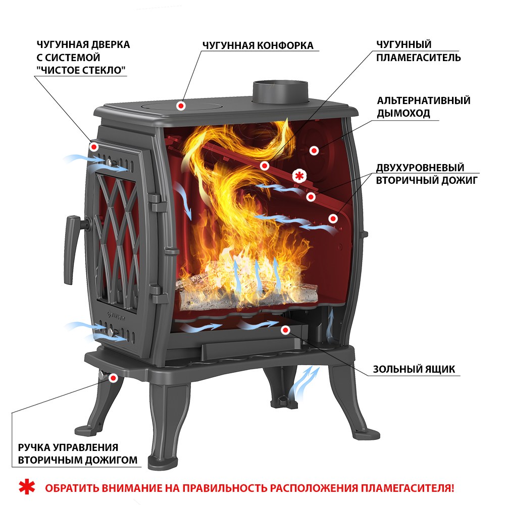 Печь-камин Везувий ВХ-09 "Антрацит" изготовлена из качественного жаростойкого чугуна с толщиной стенок 6-8 мм. Модель рассчитана на обогрев помещений объёмом до 180 м³. Печь-камин имеет пламегаситель изготовлен из чугуна. В Топки печи-камина установлена система двухуровневого вторичного дожига. С помощью этой функции по специальному каналу поступает воздух, который нагревается при прохождении между топочной камерой и задней стенкой корпуса. Далее нагретый воздух через дефлектор поступает в топку, перемешивается с газами - продуктами горения, чем вызывает повторное возгорание. Регулировка этой системы, осуществляется заслонкой, расположенной в нижней части печи-камина. Регулировка подачи воздуха в колосниковую зону осуществляется заслонкой, расположенной в нижней части двери. В верхней части двери расположена ручка регулировки системы чистое стекло, которая помогает оставаться стеклу чистым. Патрубок дымохода Ø 120 мм – универсальный, со сменным положением.