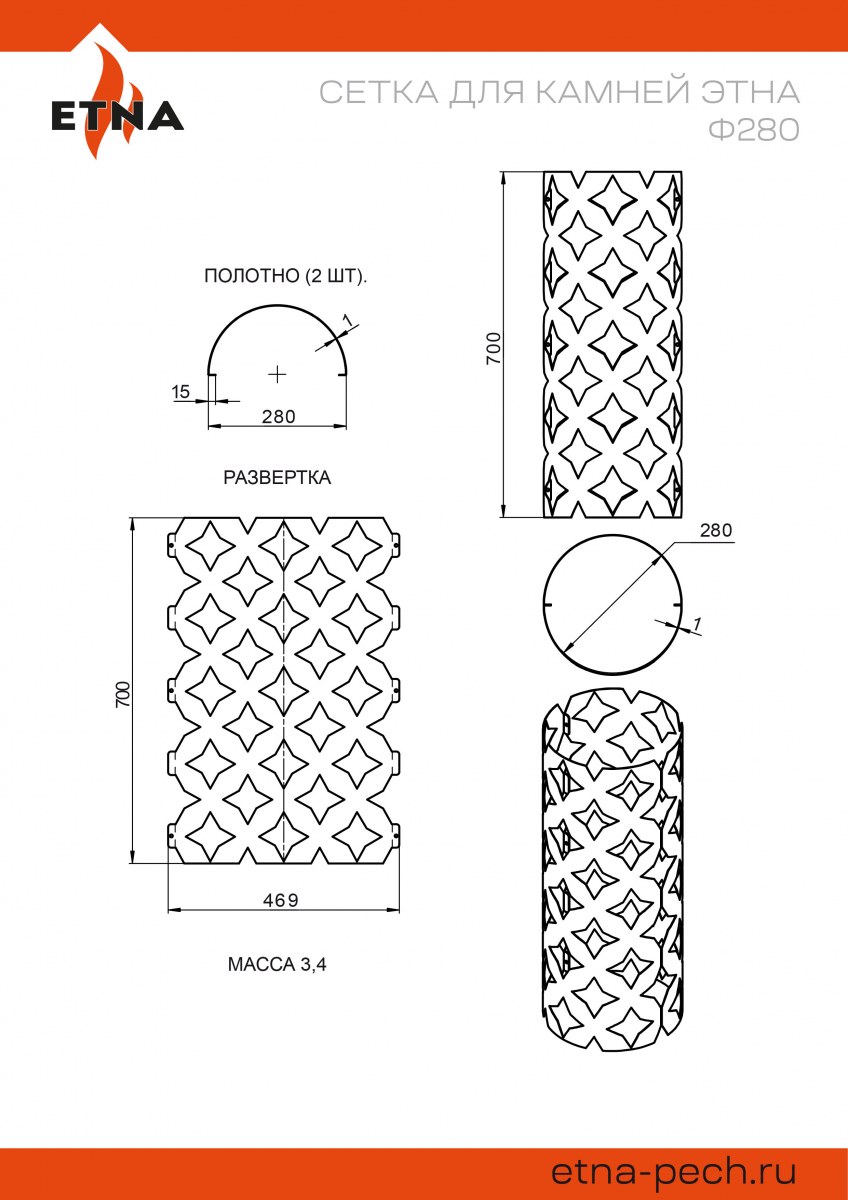 Сетка для камней ЭТНА выполнена в новом стильном дизайне, который характерен для всей линейки сеток и кожухов печей ЭТНА. Оригинальный рисунок в виде прорезных четырёхлучевых звёзд обеспечивает хорошую конвекцию и способствует быстрому нагреву камней и помещения парилки.